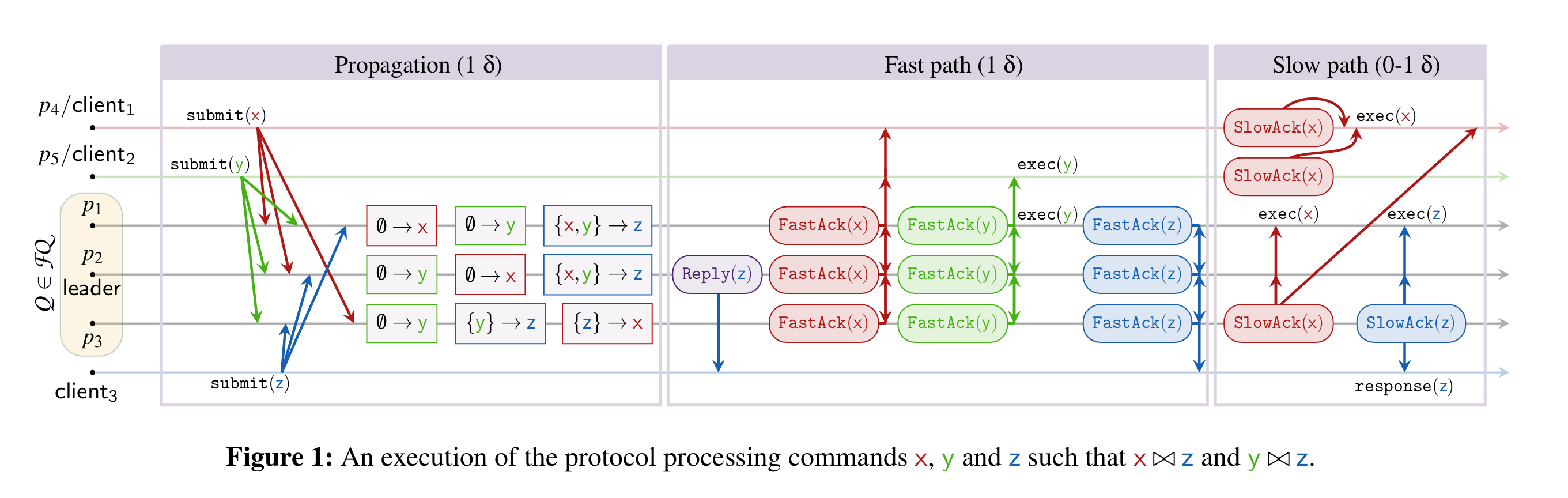 问题:已有多种旨在降低延迟的状态机复制(SMR)协议提案。其中一种方法由 Fast Paxos4 首次提出:客户端直接联系副本(replica),绕过领导者(leader),并让每个副本独立地对命令进行排序。如果足够多的副本(通常超过总数的 3/4)在命令的排序上达成一致,则采用“快速路径”(fast path);否则,就通过“慢速路径”(slow path)处理,这需要额外的消息交换来解决排序分歧。我们可以通过以下观察来提高副本在命令排序上自发达成一致的可能性:为了满足线性一致性(linearizability),副本只需就非可交换命令(即存在冲突的命令)的顺序达成一致即可 5 6。这意味着,当不存在竞争(contention)时——即各副本以相同顺序接收到冲突命令(这在实际应用负载中经常出现7 8 9)——系统仍可走快速路径。然而,采用这一思路的协议(如 Generalized Paxos5)一旦遇到哪怕仅有一对命令发生竞争,开销就会急剧增加:此时协议会变更选票(ballot),其机制类似于处理领导者故障的情形。这需要在副本之间传输大量状态,并中断所有命令的处理(包括那些并不冲突的命令)。正因如此,Generalized Paxos 在实践中并未得到广泛应用。