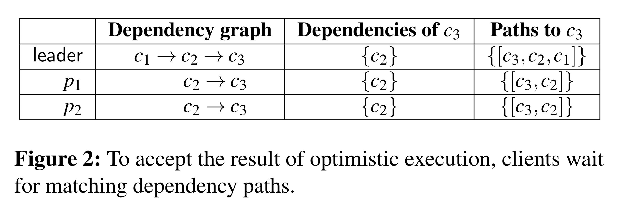 假设此时 $p_0$ 在尚未收到来自其他副本的任何消息(即该顺序尚未持久化)之前,就乐观地按 $c_1 \rightarrow c_2 \rightarrow c_3$ 的顺序执行了这三个命令,并将 $c_3$ 的执行结果发送给客户端。虽然领导者对 $c_3$ 的依赖集合提案与 $p_1$ 和 $p_2$ 一致,但三个副本在 $c_3$ 的传递依赖上存在分歧。因此,客户端不能接受来自领导者的这一响应:如果领导者随后崩溃,其对 $c_1$ 的排序将丢失,从而导致乐观执行结果无效。
