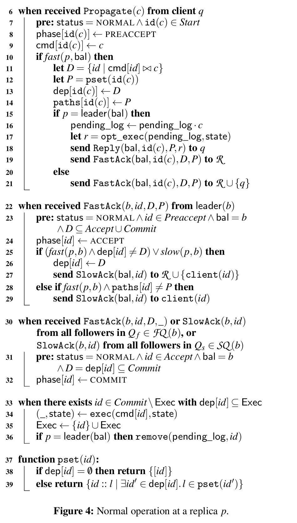 由于每个副本的提案是基于其此前已观测到的冲突命令计算得出的,因此当系统中不存在并发冲突(即无竞争)时,命令便会走快速路径——而这种情况在实际应用负载中十分常见7 8 9。
