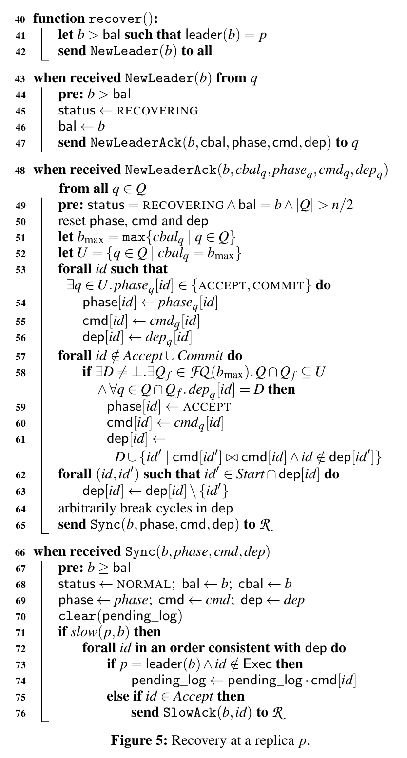 回到图 1,假设副本 $p_4$ 与 $p_3$ 之间的延迟高于 $p_4$ 与 $p_5$ 之间的延迟。此时,$p_4$ 无需等待来自 $p_3$ 的 SlowAck(用于命令 $x$),而是可以结合更早收到的来自 $p_5$ 的 SlowAck 以及来自领导者 $p_2$ 的 FastAck,通过慢速法定人数 ${p_4, p_5, p_2}$ 提交命令 $x$。由于慢速法定人数可以是任意多数集合,这一额外的提交机制确保了 SwiftPaxos 的性能至少不差于 Paxos。事实上,在慢速路径上,SwiftPaxos 等价于 Paxos 的一种广为人知的优化变体——其中跟随者会向所有副本广播 2B 类型的消息。