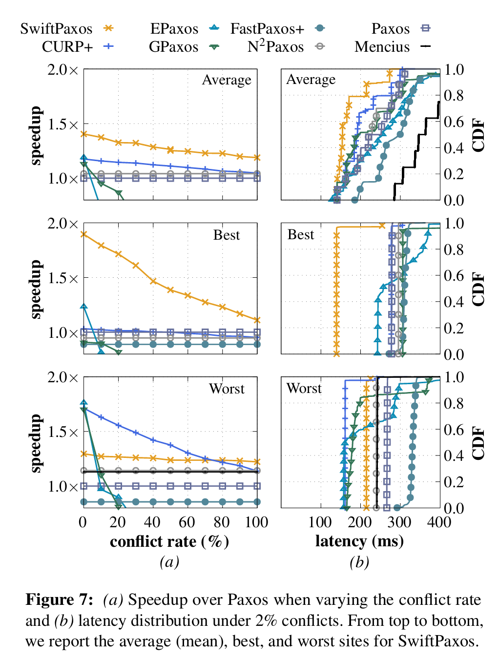 贡献:为了解决这些局限性,本文提出了 SwiftPaxos——一种新的状态机复制(SMR)协议,可在地理分布的数据上提供快速的线性一致性操作。当某条命令与并发提交的命令可交换(commute)时,SwiftPaxos 能在 2 个消息延迟内完成该命令的处理(快速路径)。否则,SwiftPaxos 仅需领导者额外花费 1 个延迟来解决冲突,总体共需 3 个消息延迟(慢速路径)。与 Generalized Paxos5 不同,慢速路径不会干扰系统运行,也无需传输大量状态数据。由于在 SwiftPaxos 中冲突由领导者负责解决,因此与 EPaxos8 不同,它还表现出较低的尾部延迟(tail latency)。因此,SwiftPaxos 在不恶化最坏情况延迟的前提下,显著降低了最佳情况下的延迟(相比传统 Paxos)。