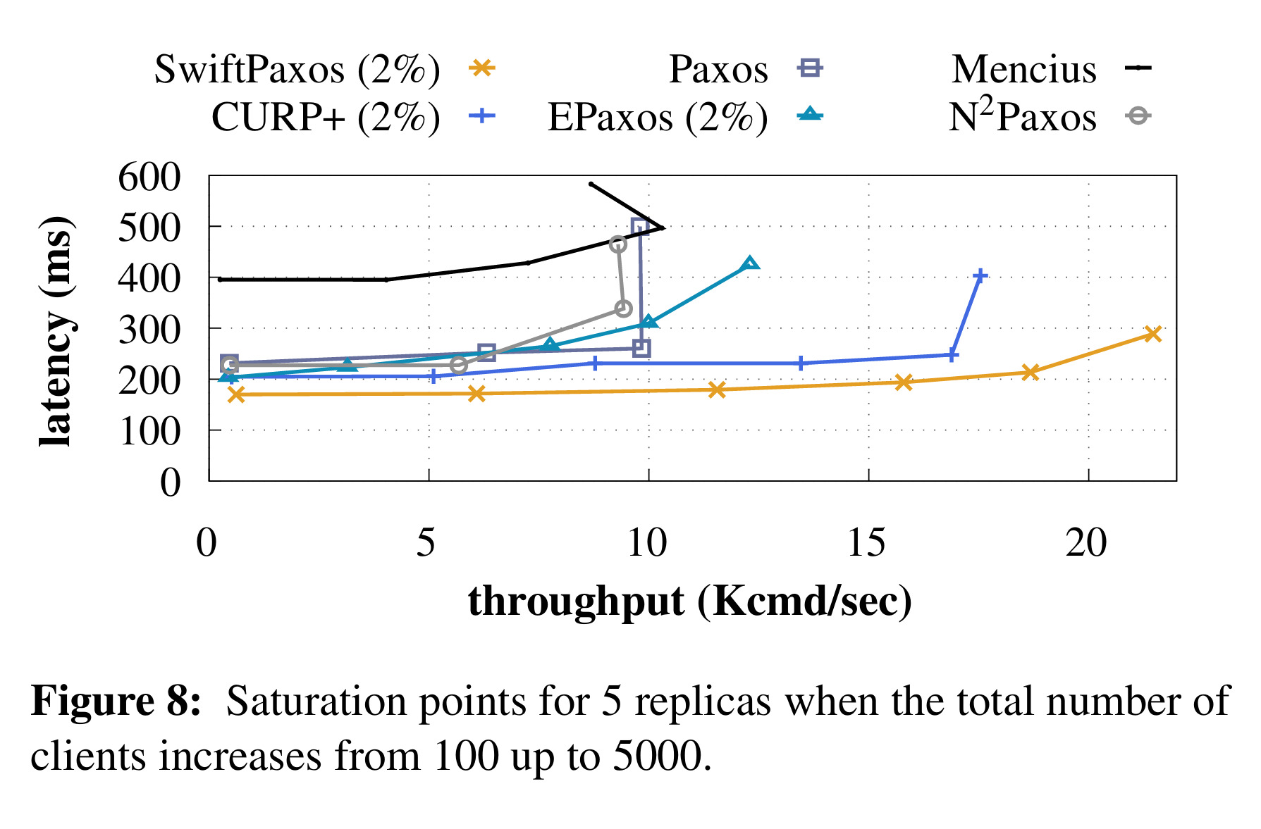 相比之下,SwiftPaxos 中的依赖关系始终保持无环(见 §3.2 的INVARIANT 3),因此命令执行可直接遵循依赖顺序。命令被提交后到实际执行之间的唯一延迟,类似于 Multi-Paxos 中的情形——在 Multi-Paxos 中,每个共识实例都依赖于前一个实例。这使得 SwiftPaxos 与 Paxos 的尾部延迟具有可比性,我们在 §5.2 中通过实验验证了这一点。我们还在 §A.6 中计算了 SwiftPaxos 的理论延迟,并将其与其他协议进行了对比。